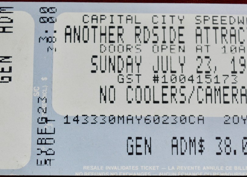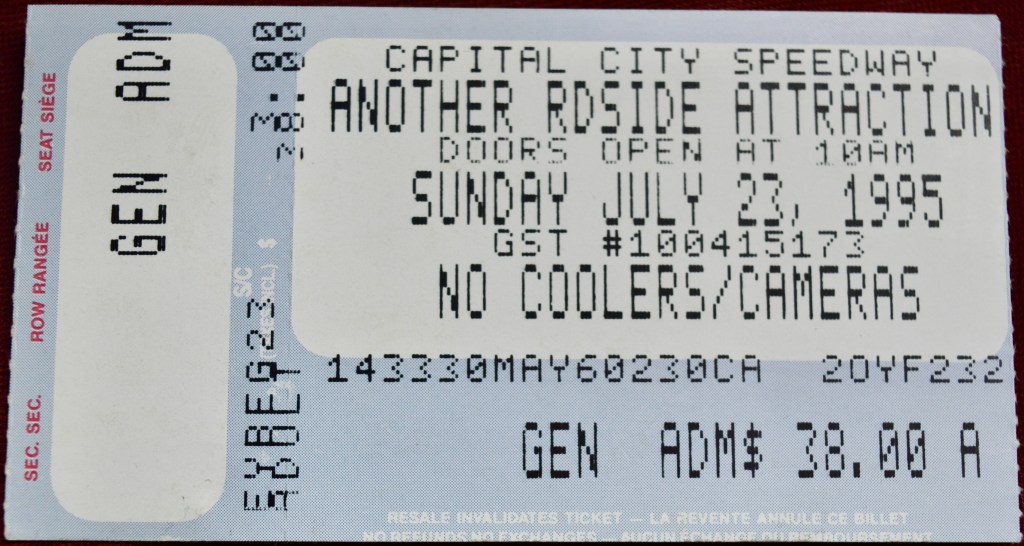 Anyway, the rock and roll carnival pulled into its Ottawa stop on July 23rd, 1995 and was held at the Capital City Raceway, a stock car oval quite a ways out of town on highway 17. Not nearly as prestigious (or accessible) as Lansdowne, where the Ottawa show on the tour had taken place a couple of years earlier*, but a step up from the Rideau-Carleton Raceway, where ARA would come to next**. This marked my only time seeing a concert (or race for that matter) at the speedway, and that doesn’t hurt my feelings one bit.