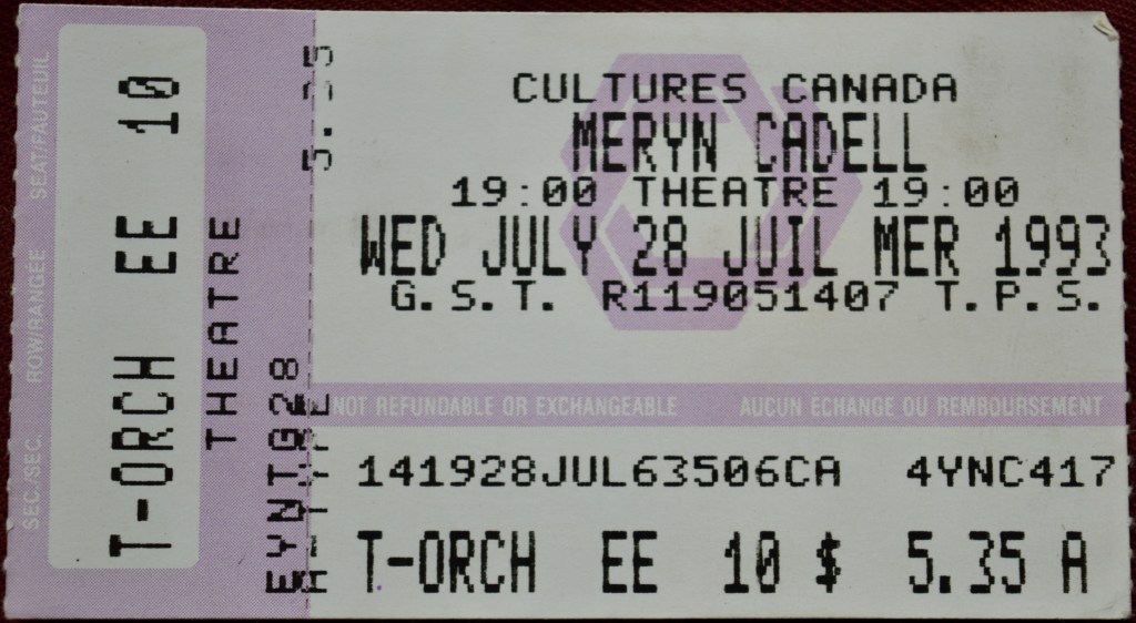 And though The Sweater didn’t hit me nearly as hard as Here I Am did, it was hard enough to convince me to buy a ticket to see Cadell perform in the theatre of the National Arts Centre on July 28th, 1993, though at less than $6 a ticket I suppose I didn’t need a whole lot of convincing. I can picture her on the stage but my memory doesn’t recall whether she had a band with her or if she was just singing/talking along to backing tracks. I remember the show being a bit of a letdown but only because I had already heard her (it’s often hard for an act’s live show to live up to their recording and vice versa). I mean, if this had been the first time I heard that “subtle goat-like smell” quasi-punchline I think I would have swooned from my cushy seat that same way my heart leapt to my throat when Lyle Lovett saidsang “make it a cheeseburger…”