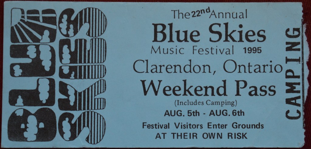 I have a hard time believing that it took until 1995 before I attended my first Blue Skies Festival but I dug through my ticket books and all the evidence supports it. I actually started thinking that this might have been my first camping festival but no, turned out that was Woodstock ’94. Regardless, I showed up for my first Blue Skies on August 5th of that year, and I was almost ready for it too.