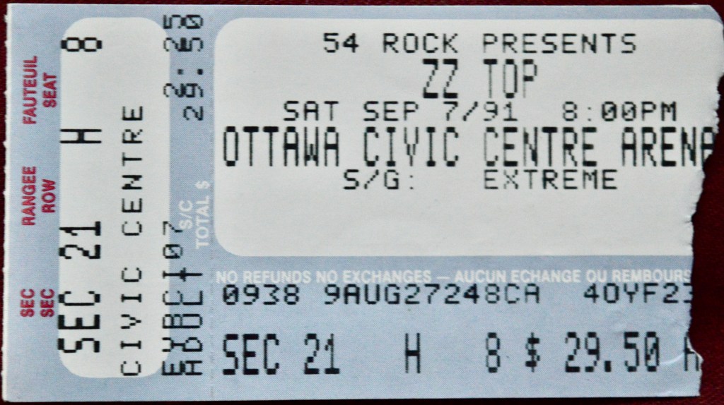 On September 7th, 1991 I walked to the Ottawa Civic Centre to see ZZ Top and Extreme.  I distinctly recall being really excited about this show; I had long been a fan of ZZ Top and was especially psyched to hear Billy Gibbons play the guitar, but having Extreme on the bill pushed things over the edge for me.