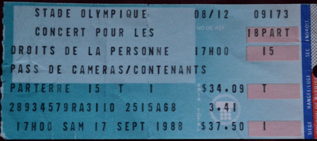 Anyway, I met a girl that was hanging out with her friends. I told her that we had driven to Montreal from Moncton to see the Bob Dylan concert at the Forum and she responded by telling me about an upcoming concert that I might be interested in returning for. It was something called Amnesty International Human Rights Now! and it would be an all-day affair featuring sets by Sting, Peter Gabriel and several others at the Olympic Stadium.