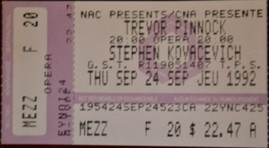 I suspect that this ticket from September 24th, 1992 marks the first time ever I saw the NAC Orchestra perform. If true, it would also mark only the second time I ever heard a live orchestra. My orchestral cherry had been popped during a Moncton High School band trip (I played the trumpet) to Sackville to hear the Mount Allison University Orchestra play.