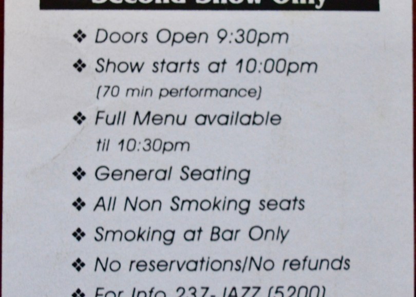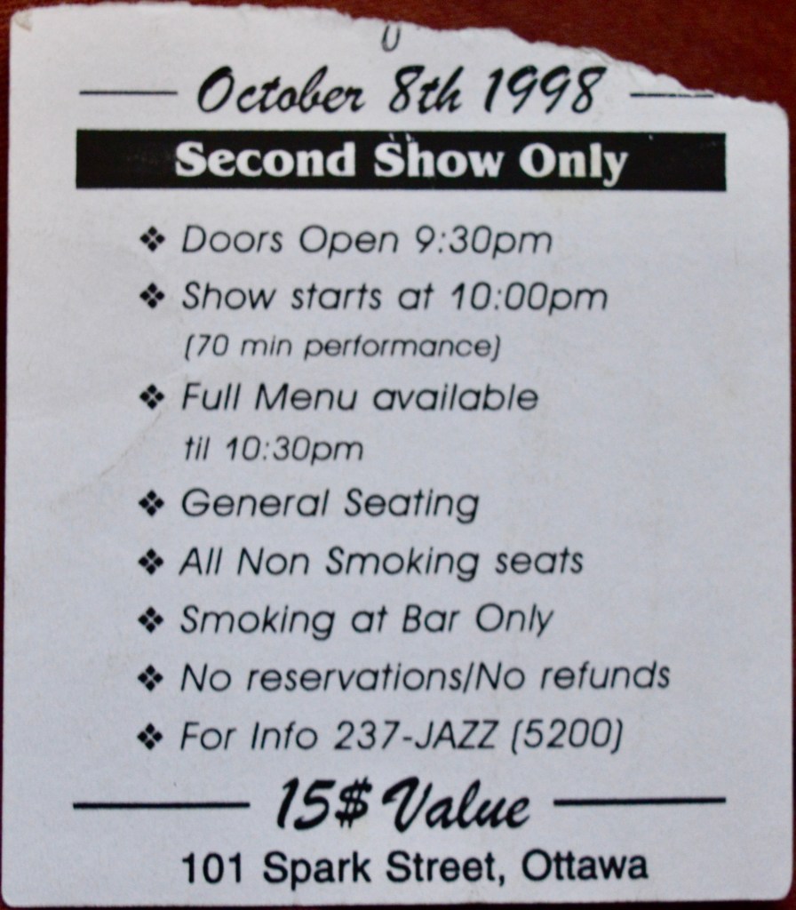 As a matter of fact, the Ed Bickert concert on October 8th, 1998 might mark the only time I saw a show at After 8, a truly beautiful bar in a prime location on Wellington Street, it’s front doors directly across the street from the front doors of Parliament’s Centre Block. The room was very classy with its marble pillars and high ceilings, and it was small enough to make it a great place to see a band. I remember maybe a dozen small tables in there, and there was a very elegant bar (where, as the ticket suggests, smokers were still free to light up).