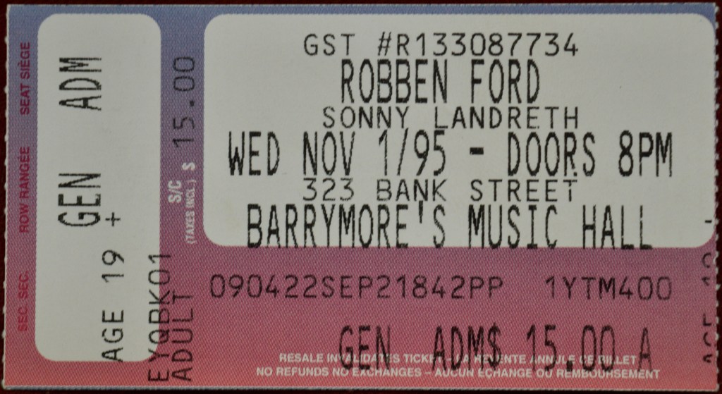 On November 1st, 1995 I went to the wonderfully nostalgic old rundown Ottawa mainstay Barrymore’s Music Hall to see a performance by Robben Ford, with Sonny Landreth opening the show.