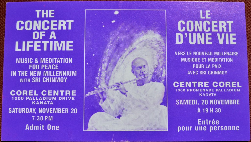I had seen a thousand posters for it over the previous month or so: The Concert Of A Lifetime with Sri Chinmoy. Every telephone pole in the city had at least two large posters taped or stapled up (in violation of both local postering rules and standard postering etiquette), the posters were in shop windows and on placards all around the city. This Sri Chinmoy guy (1931-2007) was obviously running some sort of religious cult or something, and judging by his ability to organize such a massive and/or extremely dedicated street-team to advertise a free concert at a place as big and prestigious as the Corel Centre, he was obviously pretty good at it.