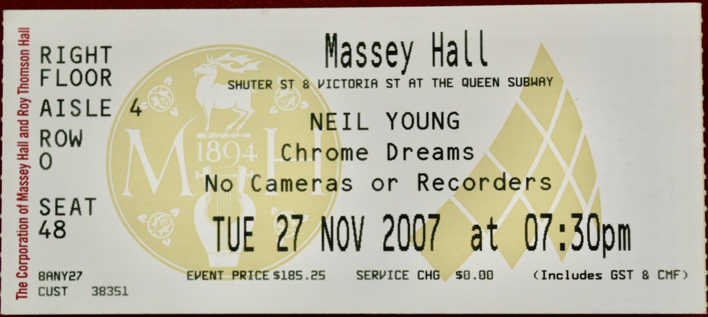 All of this is a heck of a lot of preamble simply to bring us to November 27th, 2007, when I sat in Massey Hall for the second of a three-night run of Neil Young concerts. When he started of with From Hank to Hendrix it was immediately clear that he was going to repeat the same setlist every night, and with very minor (but beautiful) alterations that’s what he did. I remember sitting there being disappointed that such pricey tickets were going to yield the same results for three nights running but I was soon lulled into being thrilled instead. Neil Young is so present-in-the-moment, he is so bloody Zen that he just can’t play the same song twice, any more than you can step into the same river twice. He plays with such conviction, such emotion that it’s like everyone in the room is hearing the song for the first time, Neil included.