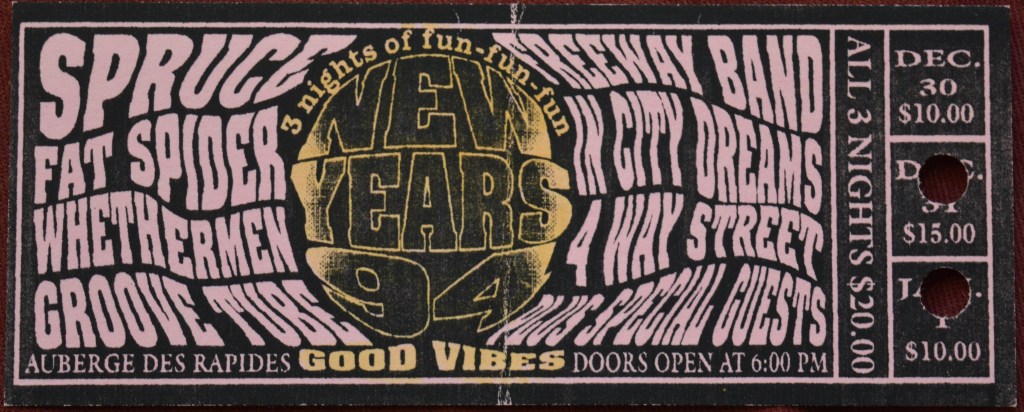 And oh, the music! Of course none of these names will mean anything to anyone outside of the late ’80’s to mid-’90’s Ottawa music crowd, but let me promise you this lineup was stacked with talent. I wrote in my ticket book that I saw Spruce (which was a softer hippie conglomeration that basically pioneered Ottawa’s mini Haight-Ashbury street of peace, love, and music: Spruce Street), 4 Way Street (which was and I suppose still is a rather good CSNY cover band, but is not an actual street), and Fear & Loathing, which was an acoustic duo comprised of Beau and Mike from Freeway Band.