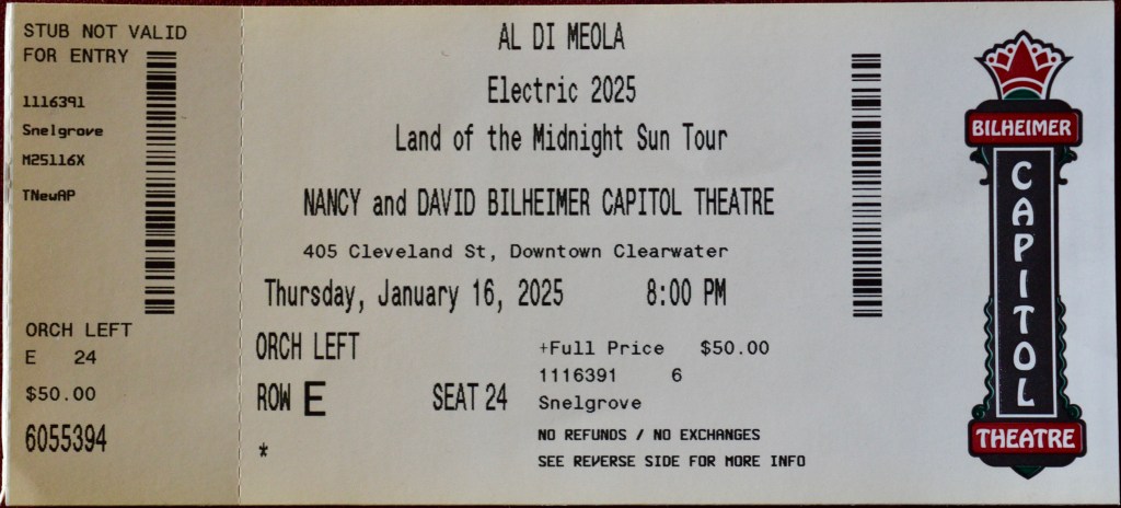 On January 16th, 2025 I found myself heading south from my mom’s winter place in New Port Richey to the Ruth Eckert Hall in Clearwater. With a half-dozen zigs and zags to navigate on the dark and mysterious Florida highways and byways I temporarily suspended my anti-GPS stance and dutifully followed the loud and impersonal orders barking from the car’s sound system.