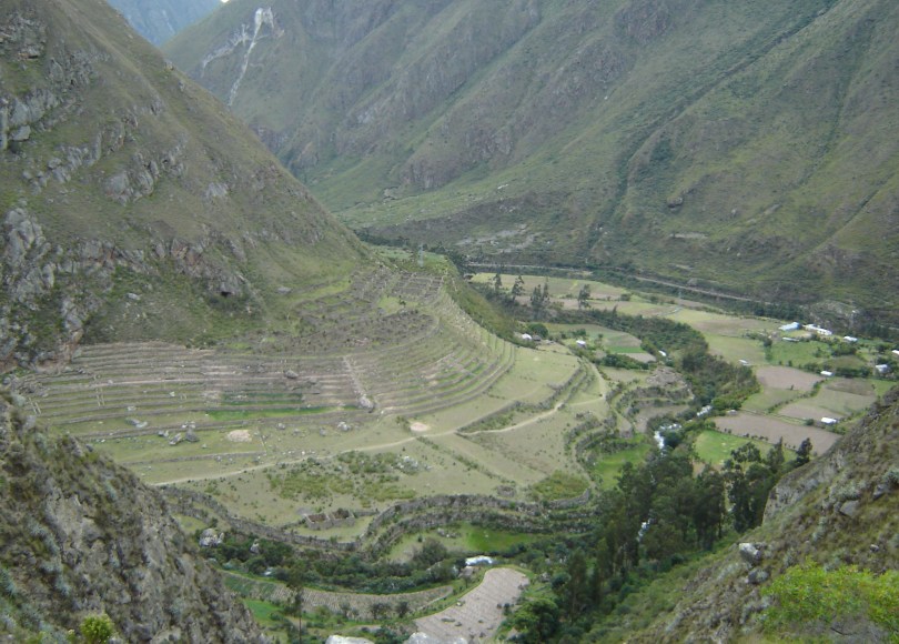 Here we were introduced to our porters, of which there were many. Recent regulations stated that there had to be at least one porter on the trail per tourist, and the maximum load any porter was allowed to carry was twenty kilos. As this was being explained I glanced at the growing amount of luggage that was being offloaded from our van and realized with a start that our collective supplies – tents, stoves, food, etcetera – was all still on the roof! I swear, the Nice people each had a large backpack plus a huge green army surplus bag per person (and then some), and the Hungarian guy had literally the biggest backpack I’d ever seen. All I had (for my whole trip to Peru) was the sort of shoulder bag a teenager might take to school every day. It didn’t weigh ten kilos fully stuffed, so I was good. The French folks carried their backpacks and employed a small army of porters to carry their extra bags, while the Hungarian hired a porter to carry his massive backpack so he would be free to hike laden with only his camera and a small bottle of water.