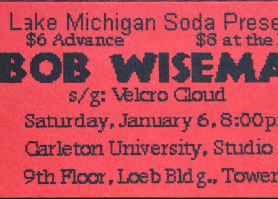 When I saw Bob Wiseman at The Pit in the summer of ’95 I joined the small enrapt crowd sitting on the grungy floor of the basement dive bar and swooned to every soft, poignant song the acidic balladeer threw our way. Unfortunately my two drunk friends stood by the bar yakking loudly all night…