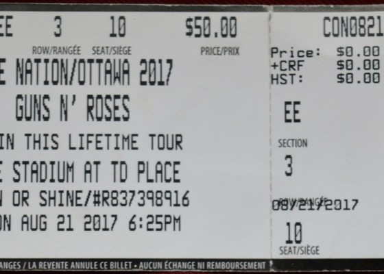 On August 21st, 2017, as my regular morning bike ride took me past Lansdowne Park it occurred to me I had only seen Guns N’ Roses once, and that had been twenty-five years before. So when I arrived home and saw that ticket prices had dropped to just $50 for the cheap seats (+40% in fees) I bit…