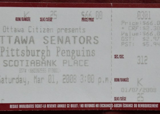 An astute observer will notice not one, but two extraneous-looking scribbles on my ticket stub from the Sens/Red Wings game on November 16th, 2015…