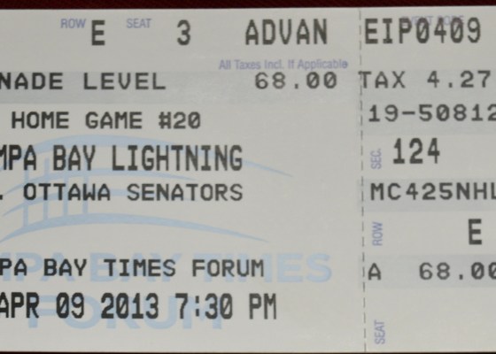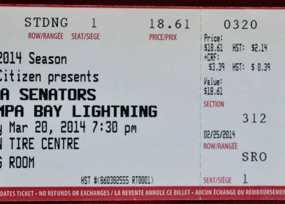 Well, looky-here! Another Sens home game, this time against my other hometown team, the Tampa Bay Lightning. Not like I live in Tampa Bay or anything, but…